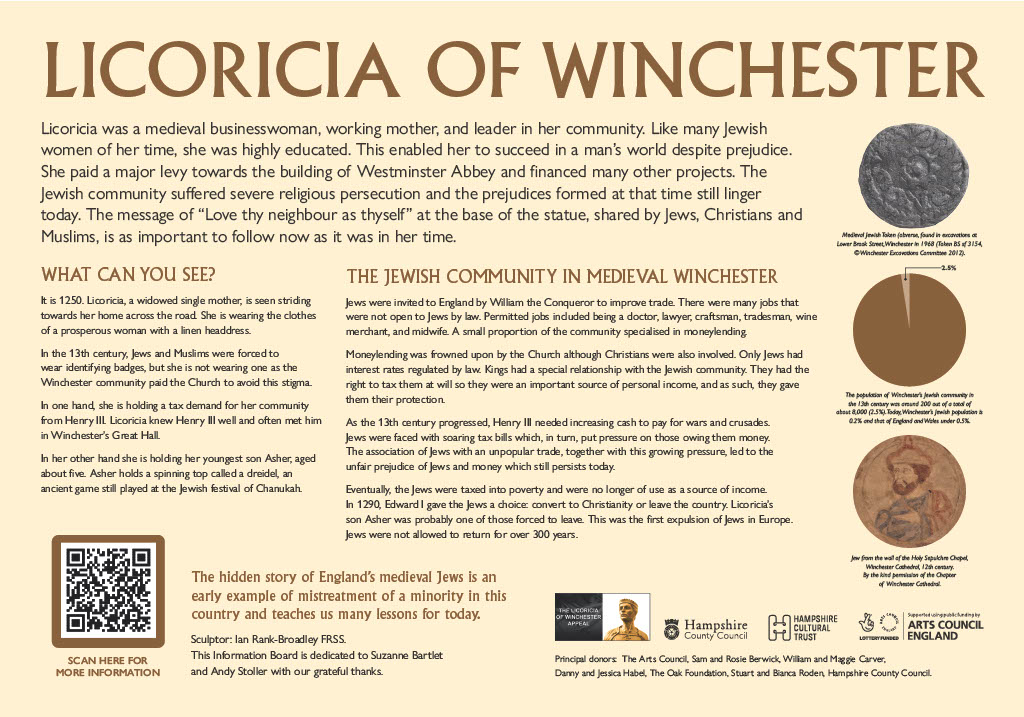 Information Board. We have been working with Hampshire County Council and Hampshire Cultural Trust for some time to erect an information board by the statue, and this was finally achieved in September. The board briefly and simply covers Licoricia’s history, Winchester’s medieval Jewish history, and our messages, and will increase our impact on visitors. A QR code provides more information.